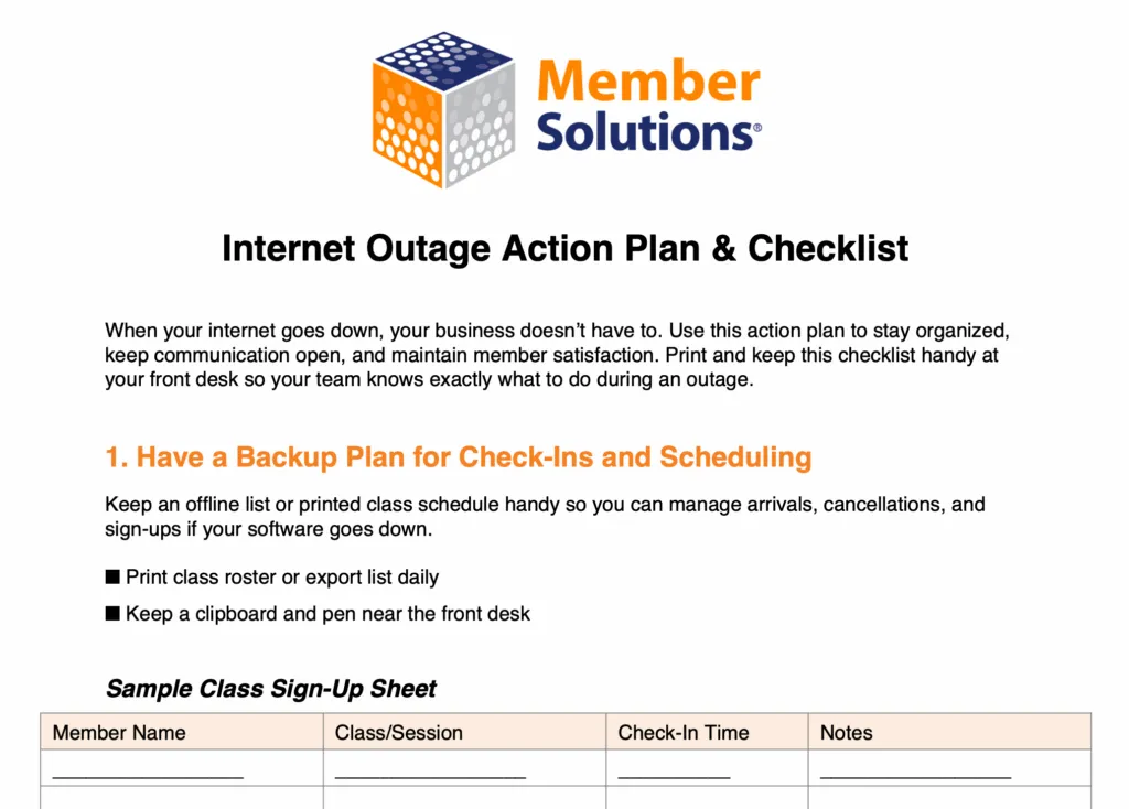 Keep an offline list or printed class schedule handy so you can manage arrivals, cancellations, and sign-ups if your software goes down. We did the work for you! You can find a handy sample version in our Internet Outage Action Plan in the next section.